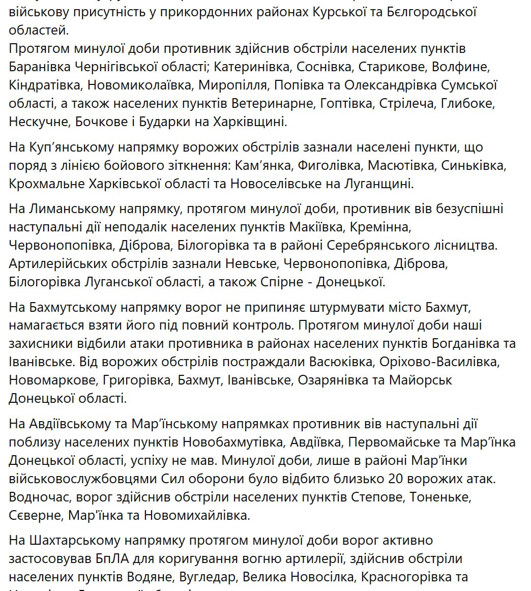 На Бахмутском направлении продолжается штурм Бахмута, противник пытается взять его под полный контроль. Также отражены атаки в районах населенных пунктов Богдановка и Ивановское.