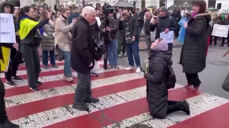 В субботу, 1 апреля, в Сети разошлось видео с девушкой, которая на коленях стояла и молилась около Киево-Печерской лавры, в то время как вокруг танцевали противники УПЦ.