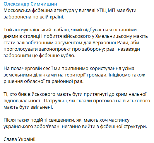 Мэр Хмельницкого Александр Симчишин в своем Telegram-канале заявил, что на внеочередной сессии горсовета УПЦ лишат всех земельных участков.