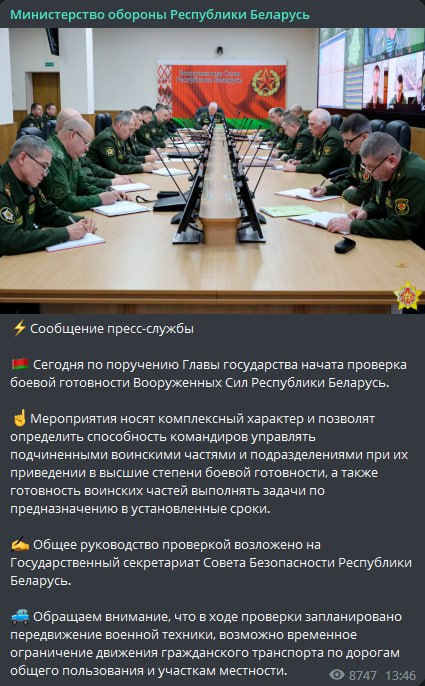 14.21 Лукашенко поручил начать проверку боевой готовности вооруженных сил, сообщает минобороны республики.