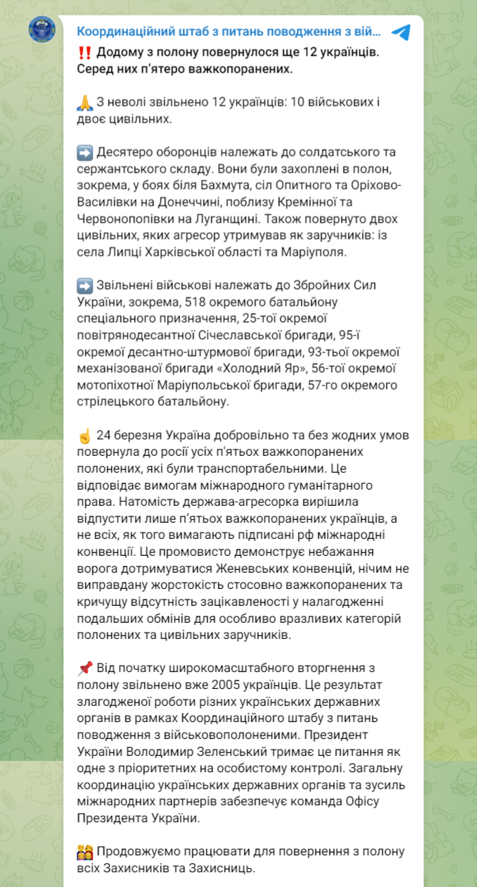 По данным Координационного штаба по вопросам обращения с военнопленными, с начала вторжения освобождены уже 2005 украинцев.