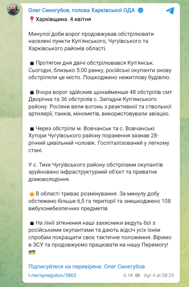 Он также рассказал об обстрелах региона за сутки. По его словам, по Двуречной россияне совершили по меньшей мере 48 обстрелов, еще 36 обстрелов пришлось на село Западное Купянского района. Россияне вели огонь из реактивной и ствольной артиллерии, танков, минометов, использовали авиацию.