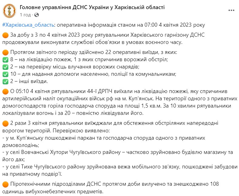 Утром во вторник, 4 апреля, войска РФ обстреляли из артиллерии Купянск Харьковской области. В результате в городе вспыхнул пожар.
