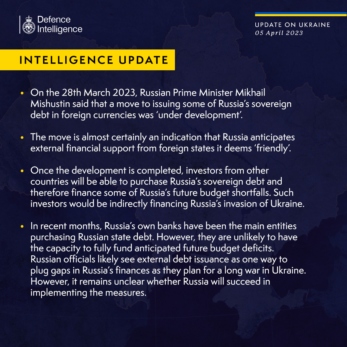 Как отмечается в сводке, 28 марта премьер-министр России Михаил Мишустин заявил, что переход к выпуску части суверенных долговых обязательств России в иностранной валюте находится "в стадии разработки". Этот шаг свидетельствует о том, что Россия рассчитывает на внешнюю финансовую поддержку со стороны иностранных государств, которых она считает "дружественными".