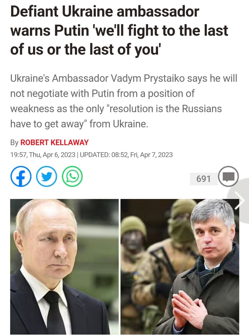 "Наше решение — русские должны уйти с наших земель.Поэтому мы должны сражаться до последнего из них или, к сожалению, до последнего из нас", - сказал посол.