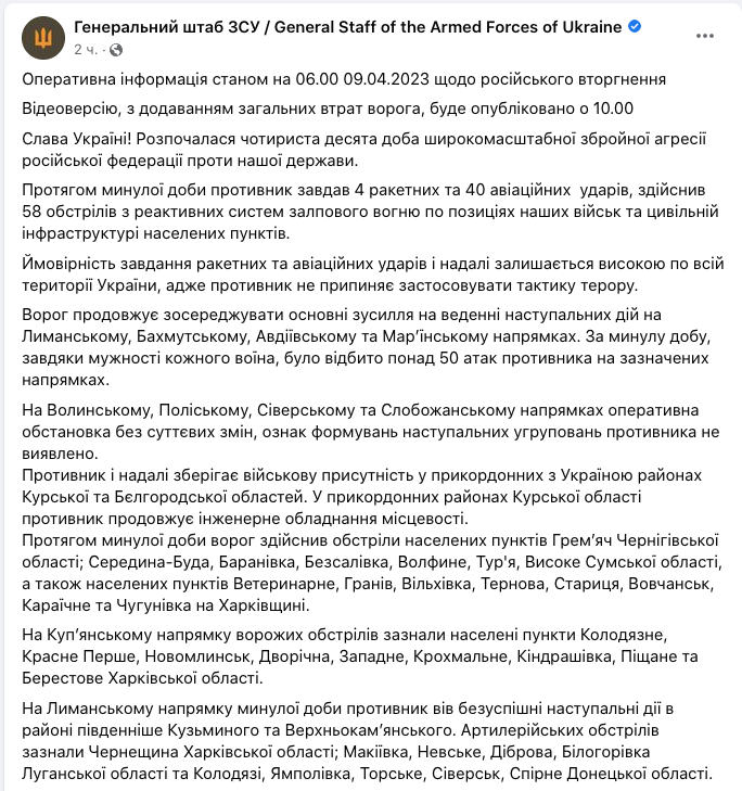 В воскресенье, 9 апреля, в Украине идет уже 410-й день войны с Россией