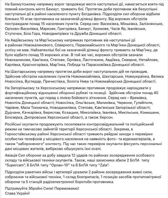 3. На Волынском, Полесском, Северском, Слобожанском, Купянском, Шахтерском, Запорожском и Херсонском направлениях обстановка без существенных изменений.