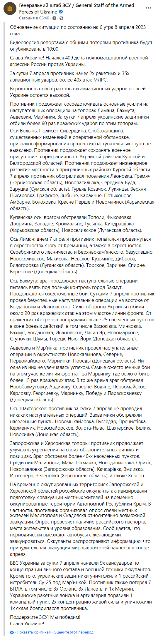 Генштаб ВСУ опубликовал сводку военных событий по состоянию на 6 утра 8 апреля 2023 года, когда за сутки 7 апреля противник нанес 2 ракетных и 35 авиационных ударов, более 40 атак МЛРС. При этом вероятность новых ракетных и авиационных ударов по всей Украине остается высокой.