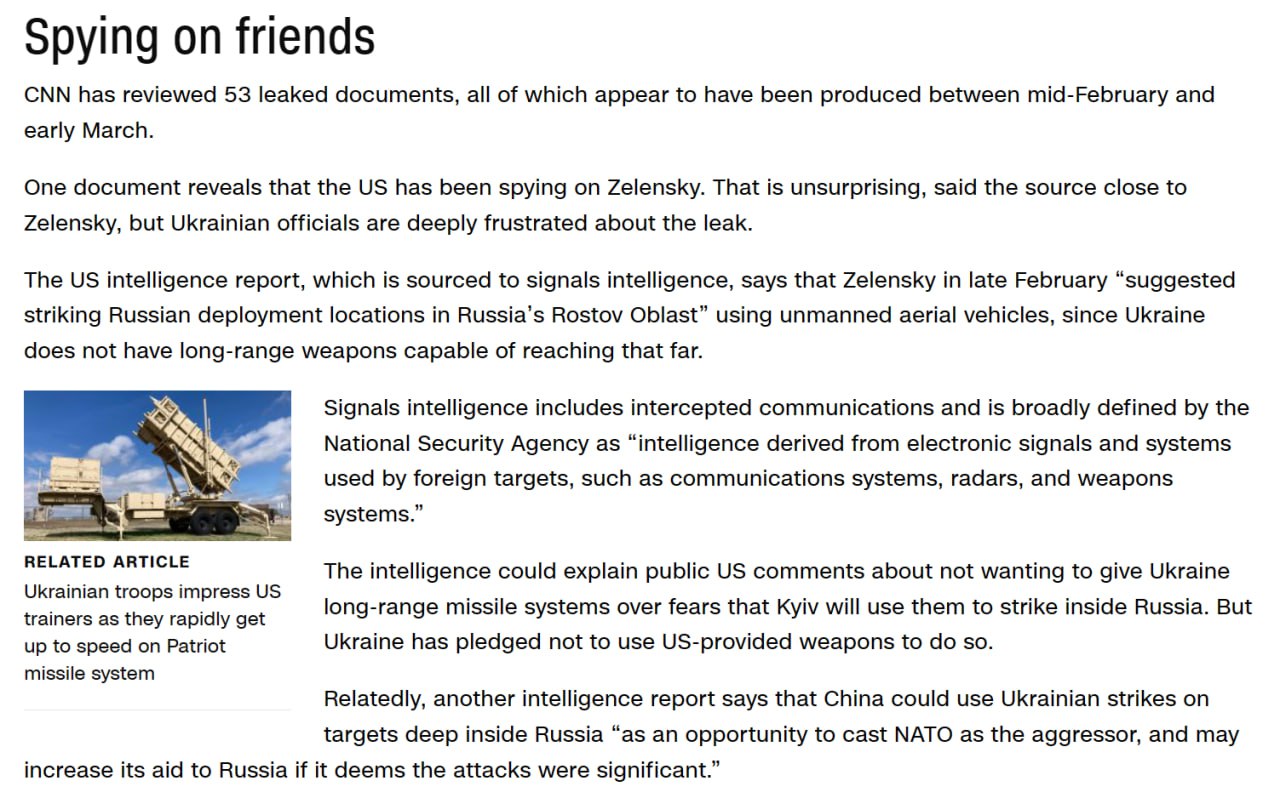 Напомним, в соцсетях появились документы с подробным описанием секретных планов США и НАТО, после чего Пентагон начал расследование. Официально достоверность утечки Пентагон не подтвердил, заявляя, что она лишь исследуется.