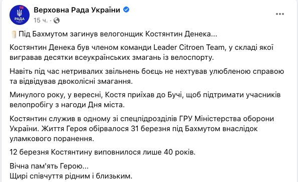 07.49 Под Бахмутом погиб украинский велогонщик Константин Денека, который служил в спецподразделении Главного управления разведки Минобороны. Ему было 40 лет.
