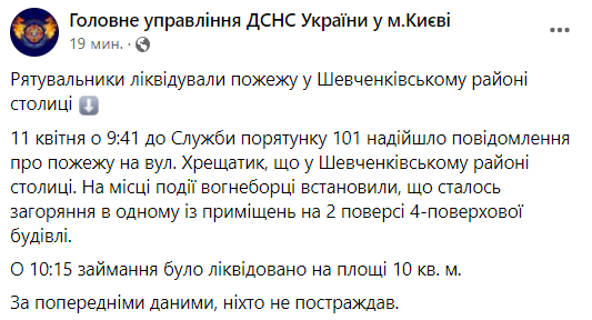 О пожаре сообщил мэр столицы Виталий Кличко в 10 утра. А уже через полчаса ГСЧС заявила о его ликвидации.
