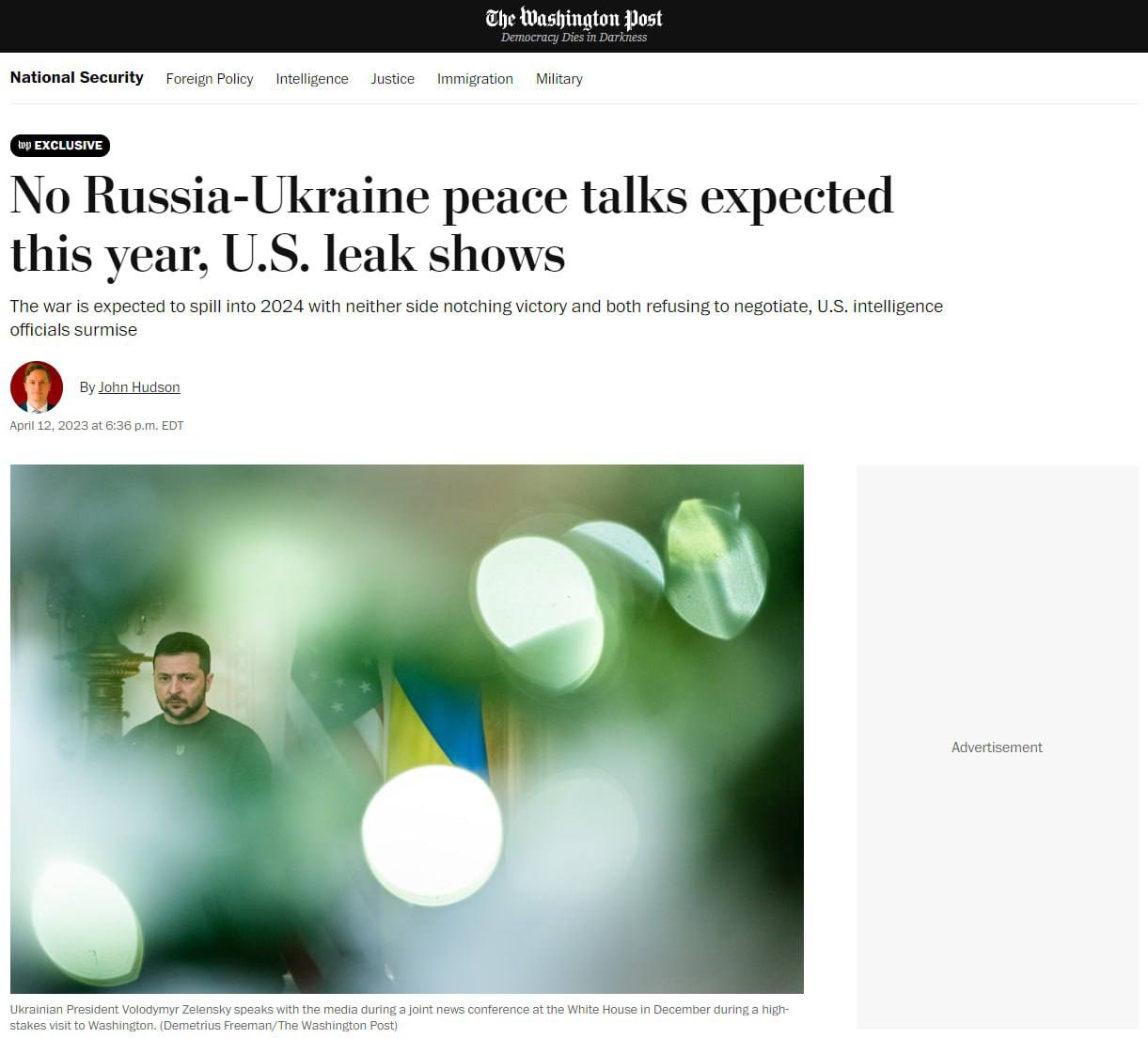 07.52 В 2023 году мирных переговоров между Россией и Украиной не ожидается, а боевые действия продолжатся и в следующем году. Такие выводы газета Washington Post делает из "утечек Пентагона".