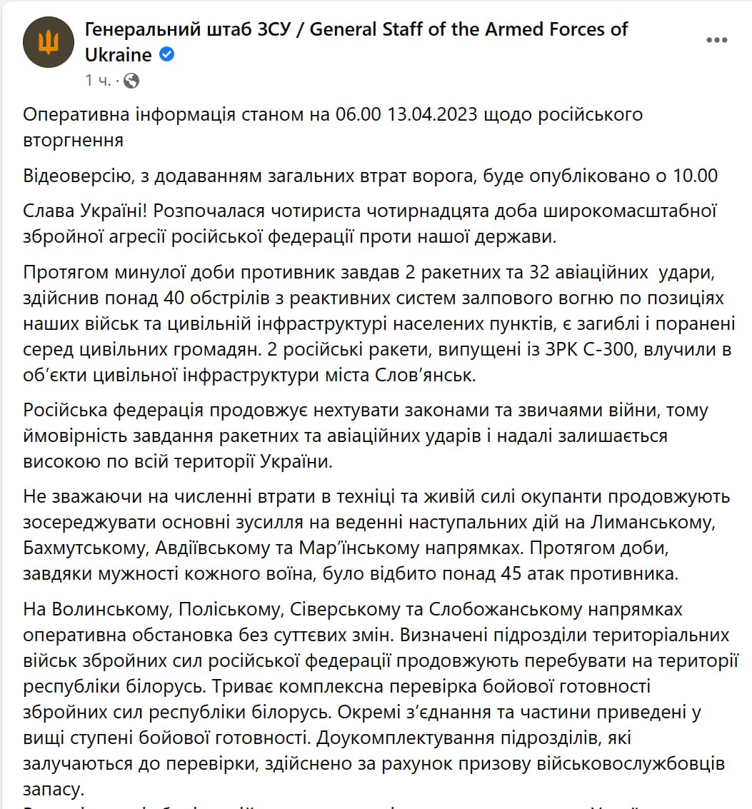 В четверг, 13 апреля, в Украине идет уже 414-й день войны с Россией