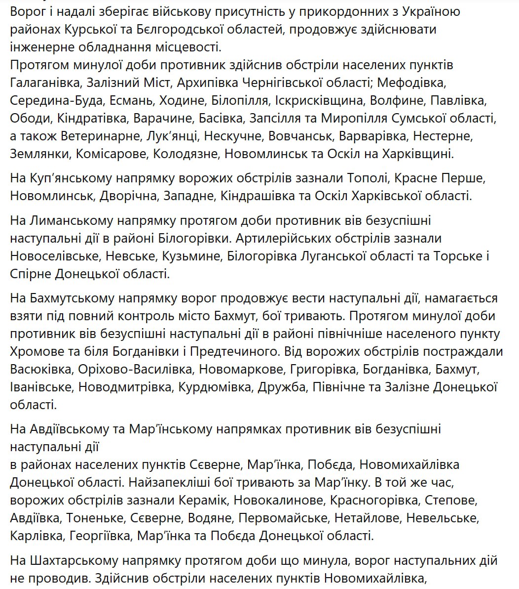 3. На Волынском, Полесском, Северском, Слободском, Купянском, Шахтерском, Запорожском и Херсонском направлениях обстановка без существенных изменений.