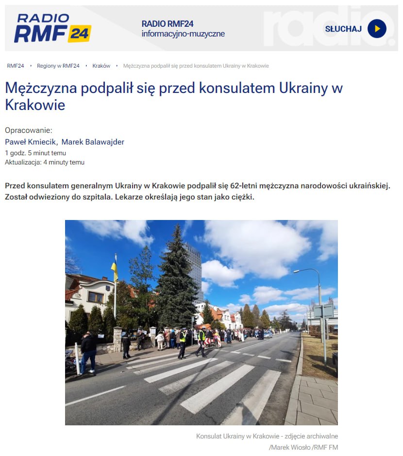 10.42 Под зданием генконсульства Украины в Кракове 62-летний мужчина попытался совершить самосожжение.