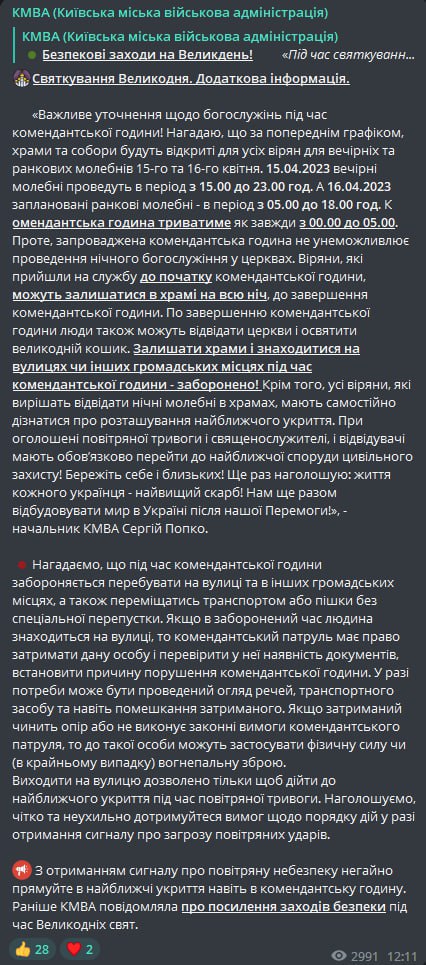 "Однако введенный комендантский час не делает невозможным проведение ночного богослужения в церквях", - заявил начальник КГВА Сергей Попко.