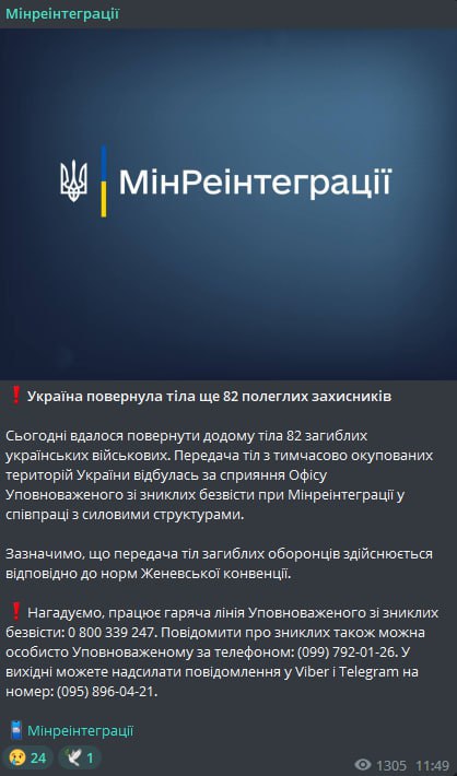 12.19 Украина вернула тела 82 погибших военных, сообщает Минреинтеграции.