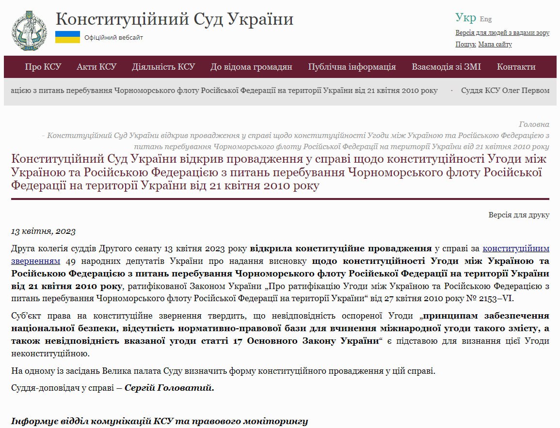 12.55 КСУ открыл производство по вопросу конституционности "Харьковских соглашений", которые продлили на 25 лет пребывания Черноморского флота России на территории Украины в обмен на скидку на цену газа.