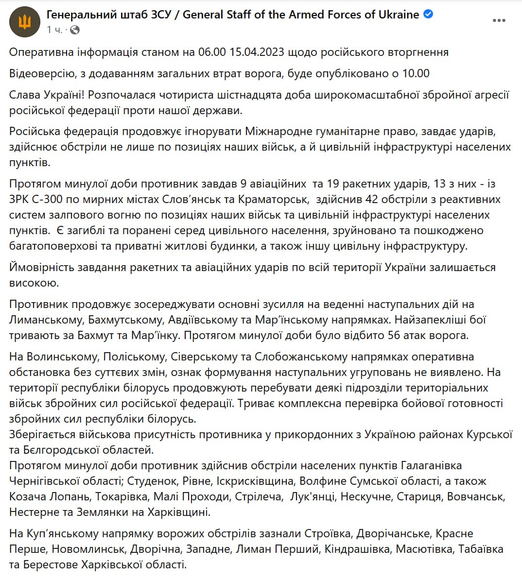 Война в Украине продолжается уже 416-й день. Мы следим за новостями 15 апреля в своем онлайне.