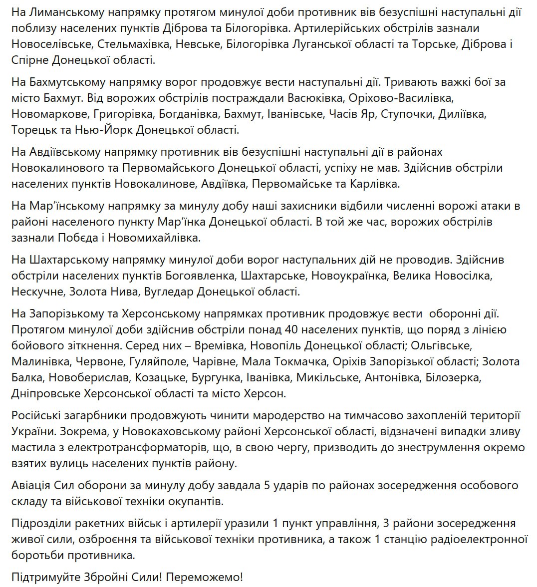 • Продолжаются тяжелые бои за Бахмут. На Авдеевском направлении противник наступал в Новокалиновском и Первомайском районах. Также отражены многочисленные атаки против Марьинки.