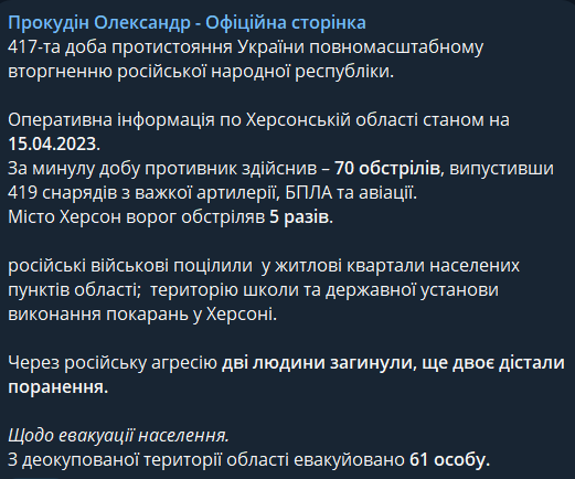 Напомним, война в Украине продолжается уже 417-й день. Мы следим за новостями 16 апреля в своем онлайне.