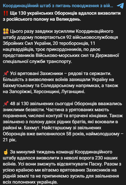 Подробности Пасхального обмена сообщает в телегрем-канале Координационный штаб по обмену военнопленными.