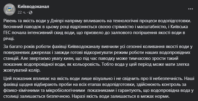 09.40 Водопроводная вода в столице может пожелтеть из-за роста уровня воды в Днепре, сообщает Киевводоканал.