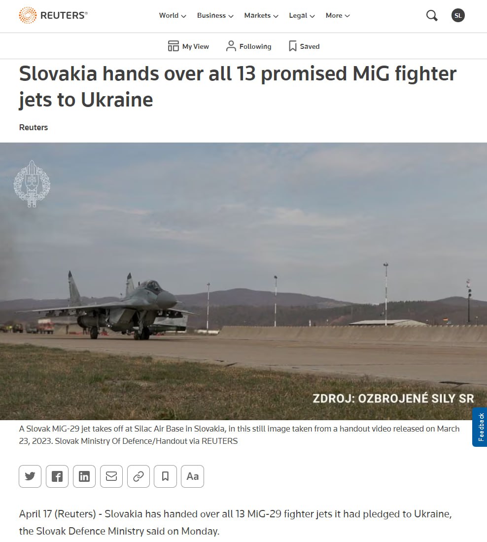 10.10 Словакия передала все 13 истребителей МиГ-29, которые она обещала Украине, сообщило в понедельник министерство обороны Словакии, передает Reuters.