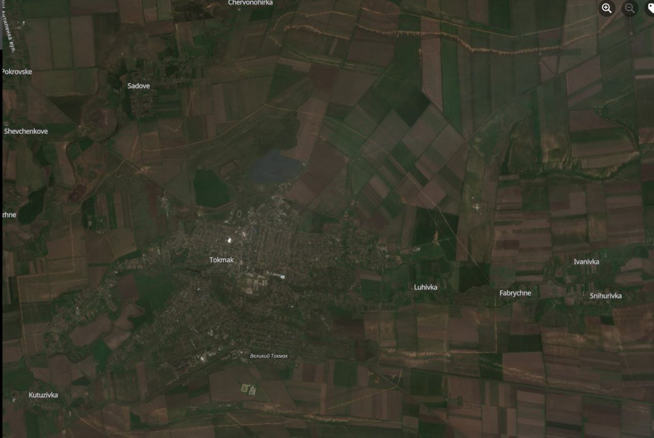 Видны цепочки окопов вокруг захваченных Токмака и Пологов.