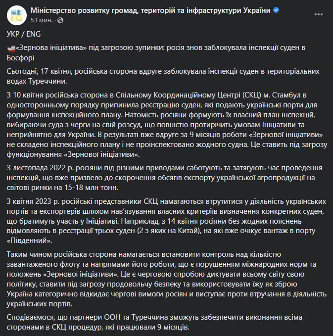 Как сообщается, с 10 апреля российская сторона в Совместном Координационном центре в Стамбуле в одностороннем порядке прекратила регистрацию суден, которые подают украинские порты для формирования инспекционного плана.
