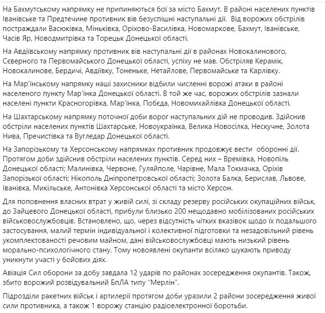 1. Отбито более 50 атак на направлениях: Купянском – в районе Синьковки, Лиманском – в районе Спорного, Бахмутском – в Бахмуте, в районе Ивановского и Предтечино, Авдеевском – в районах Новокалиново, Северного и Первомайского, Марьинском – в районе Марьинки.