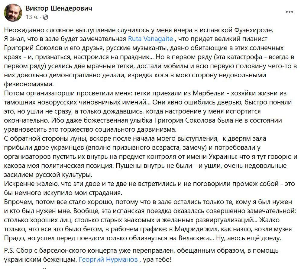 Российский оппозиционный писатель и журналист Виктор Шендерович, выступая в испанском городе Фуэнхирола, имел инцидент с гражданами Украины. По его словам, они пытались без билетов прорваться на его концерт.
