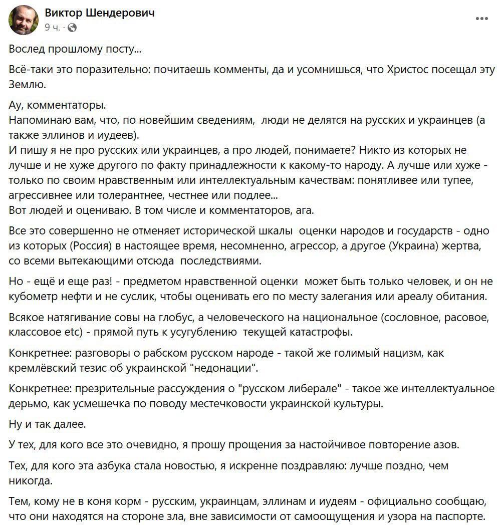 И пишу я не про русских или украинцев, а про людей, понимаете? Никто из которых не лучше и не хуже другого по факту принадлежности к какому-то народу. А лучше или хуже - только по своим нравственным или интеллектуальным качествам", - написал Шендерович.