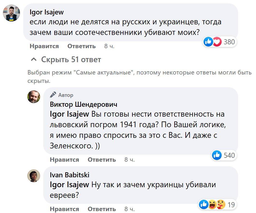 В комментариях ему снова возразили. "Если люди не делятся на русских и украинцев, тогда зачем ваши соотечественники убивают моих?", - спросил живущий в Польше украинец Игорь Исаев.