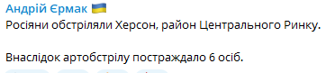 Россияне с утра обстреляли район Центрального рынка в Херсоне из артиллерии. Известно о шести пострадавших.