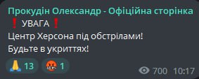 Глава Херсонской администрации Александр Прокудин призвал жителей не покидать укрытия.