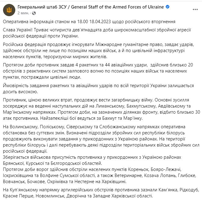 Во вторник, 18 апреля, Генштаб Вооруженных сил Украины опубликовал вечернюю сводку с фронта.