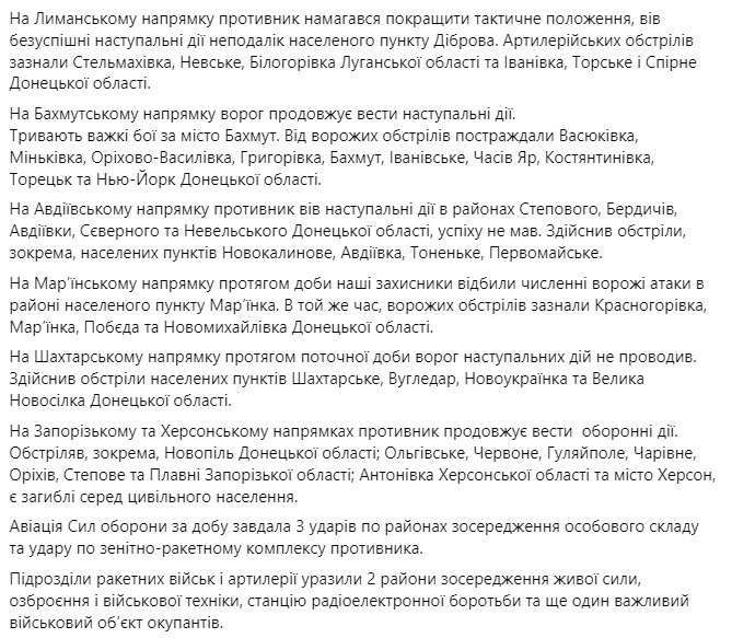 - Отбито около 30 атак на направлениях: Лиманском – в районе Дубравы; Бахмутском – в Бахмуте; Авдеевском – в районах Степного, Бердичева, Авдеевки, Северного и Невельского; Марьинском – в районе Марьинки.