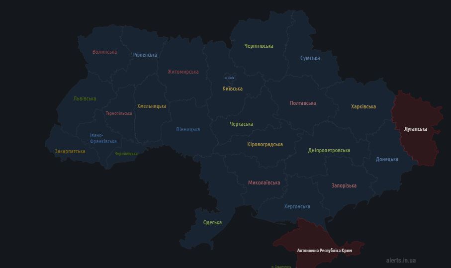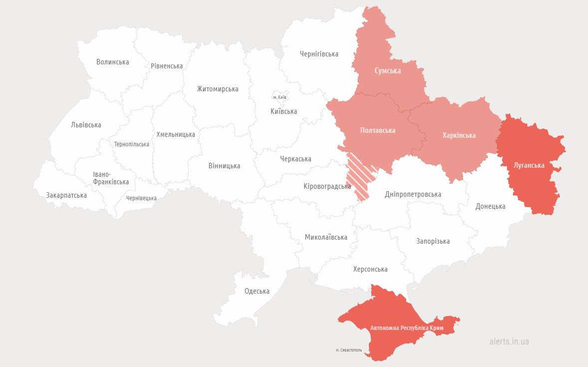22:15 Карта воздушных тревог на данный момент. Тревога объявлена также в Харьковской области.