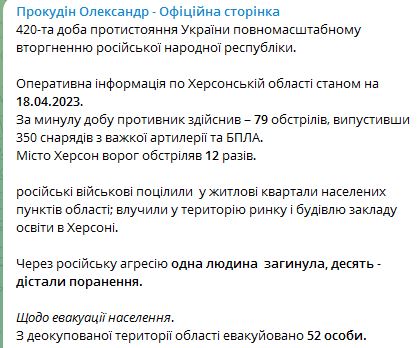 В результате российской агрессии в Херсоне и области вчера один человек погиб, десять - получили ранения.