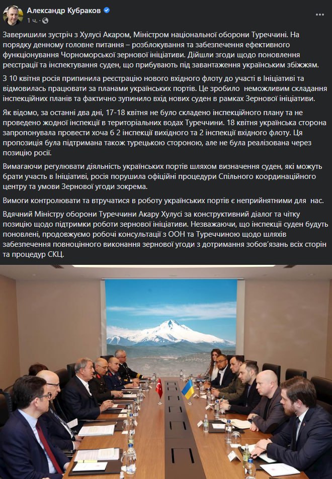 "Завершили встречу с Хулуси Акаром, Министром национальной обороны Турции. В повестке дня главный вопрос - разблокирование и обеспечение эффективного функционирования Черноморской зерновой инициативы. Пришли согласия по возобновлению регистрации и инспектированию судов, прибывающих под загрузку украинским зерном", - сообщил он.