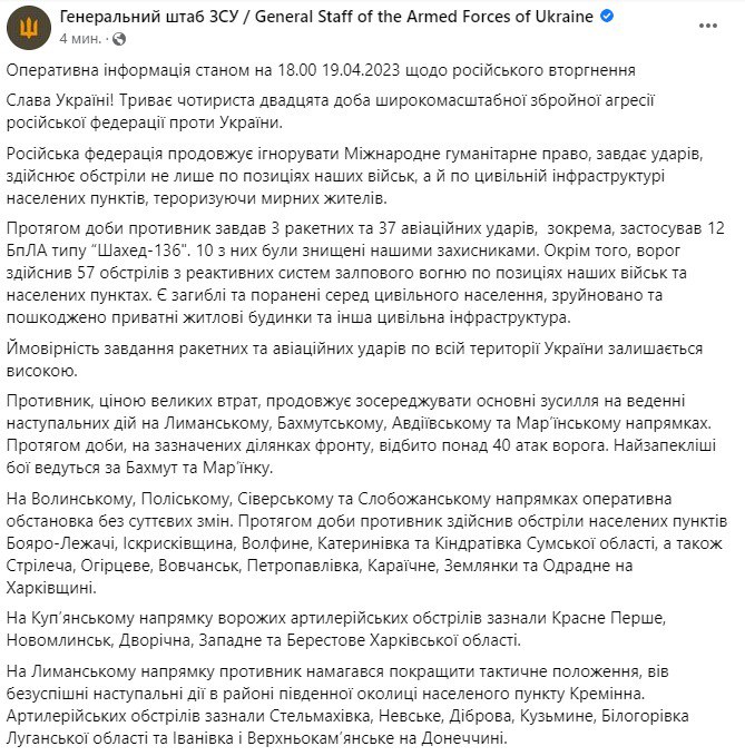 В среду, 19 апреля, в Украине идет уже 420-й день войны с РФ.