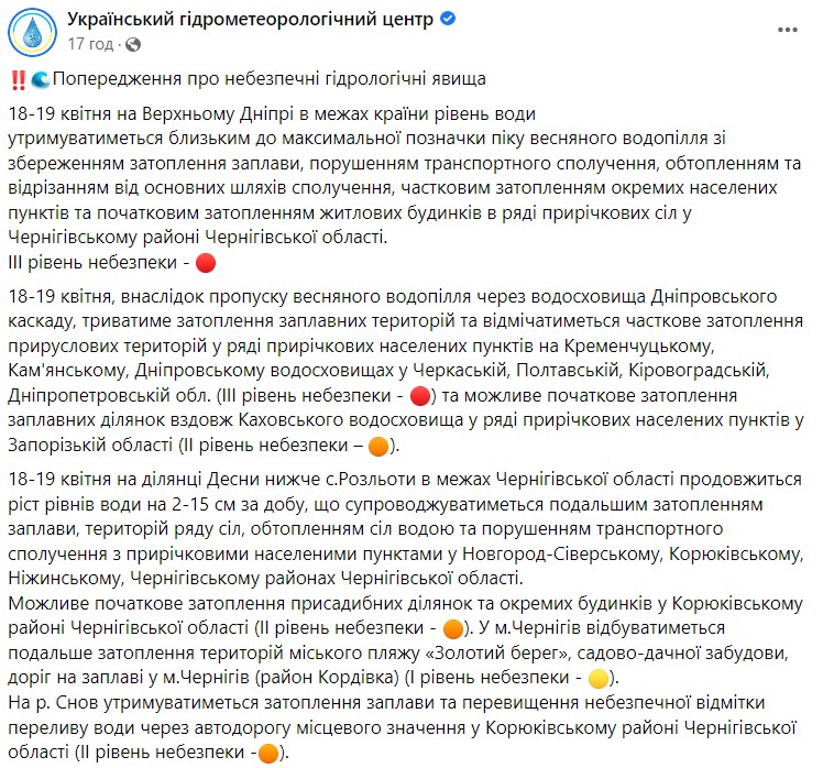 Существует опасность и начального затопления приусадебных участков и отдельных домов в Корюковском районе Черниговской области (II уровень опасности). В самом Чернигове под угрозой затопления пляж "Золотой берег", дачи.