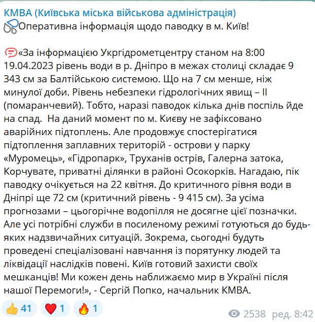 Синоптики прогнозировали пик паводков на 22 апреля. При этом позже Укргидрометцентр заявил, что катастрофического и масштабного затопления в столице не будет, поскольку вода начала отступать.