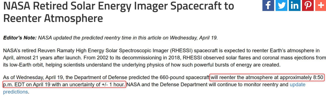 Ее сразу начали обсуждать, поскольку на сайте NASA на 19 апреля как раз анонсировалось плановое падение на Землю сателлита Rhessi.
