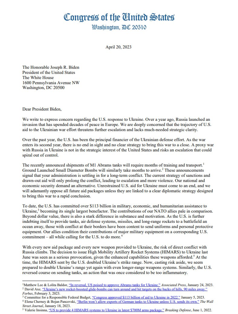 В Конгрессе США группа из 19 республиканцев подготовила совместное письмо к президенту США Джо Байдену, в котором призвала прекратить помощь Украине в таком формате, как это было до сих пор.
