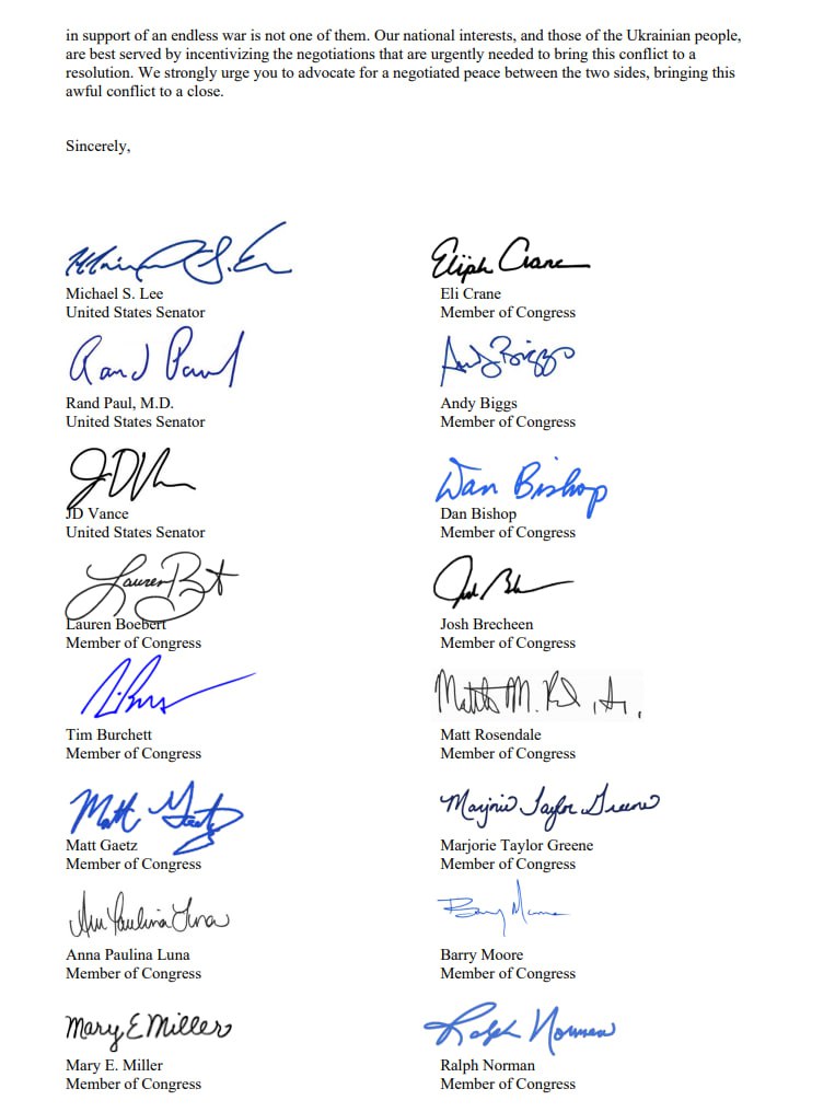"Начался второй год войны, но обозримого конца не видно, как и нет четкой стратегии, как ее завершить. Марионеточная война (в оригинале – proxy war) с Россией в Украине – не в интересах США и грозит эскалацией, которая может выйти из-под контроля", – пишут авторы письма, которое подписали 19 человек.