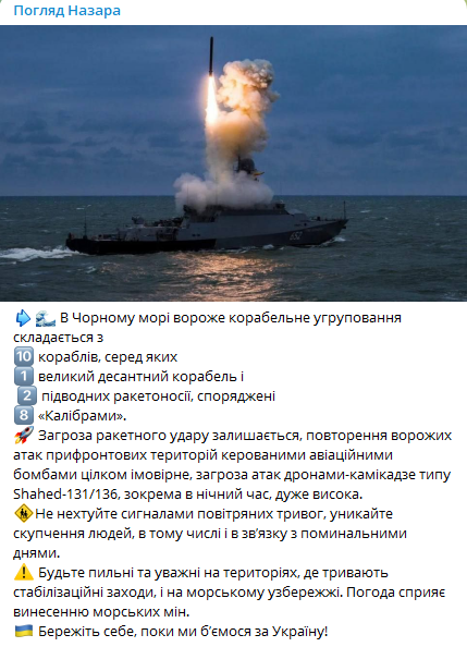 В Черном море сейчас наблюдается наличие вражеской корабельной группировки, состоящей из десяти кораблей. Из них два являются подводными ракетоносителями, снаряженными 8 ракетами "Калибр".