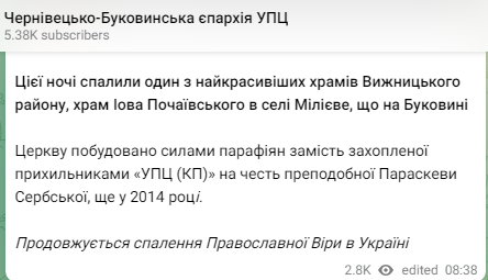"Этой ночью сожгли один из самых красивых храмов Вижницкого района, храм Иова Почаевского в селе Милиево на Буковине. Церковь построена силами прихожан вместо захваченной сторонниками УПЦ (КП) в честь преподобной Параскевы Сербской, еще в 2014 году. Продолжатся сожжение православной веры в Украине", - говорится в сообщении.