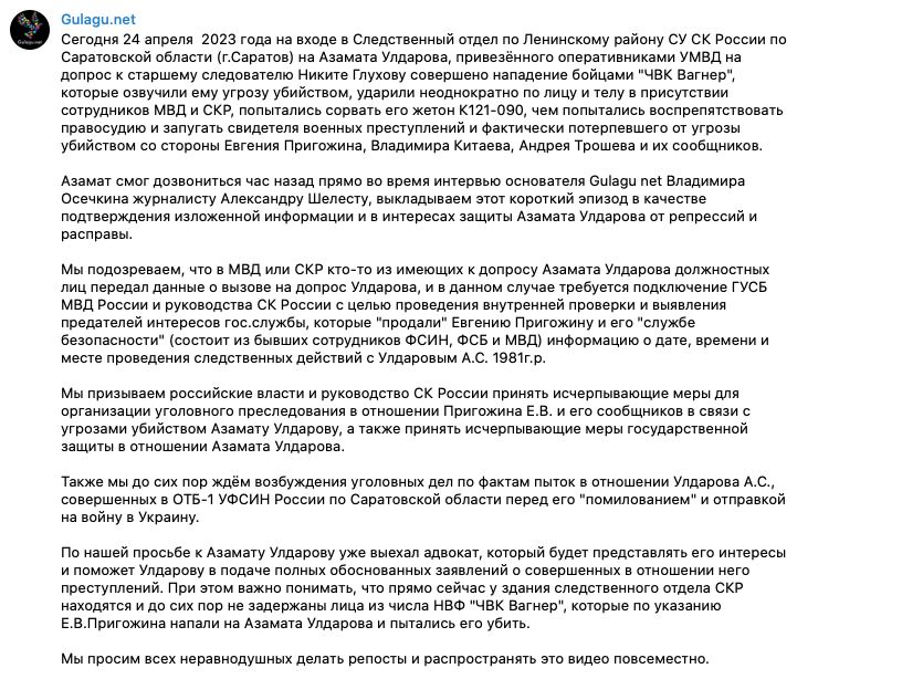 Ранее Владимир Осечкин опубликовал видео с показаниями двух бывших заключённых, которые воевали в ЧВК "Вагнер" - Азамата Улдарова и Алексея Савичева, которые заявили, что участвовали в военных преступлениях.